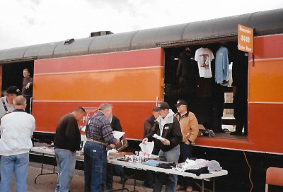 Friends of 4449 volunteers unloading souvenirs from the baggage car.