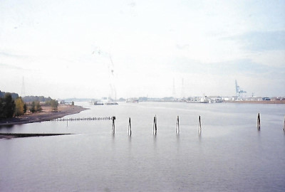 The Columbia River as seen from the Willamette River bridge.