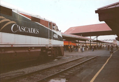 Passengers and railfans gather around the steam engine while Amtrak Cascades F59PHI 466 looks on. Bob and I gathered our luggage and walked up to the Coast Benson Hotel for our night's stay. The next day we took Amtrak Cascades 500 back to Seattle and drove home.