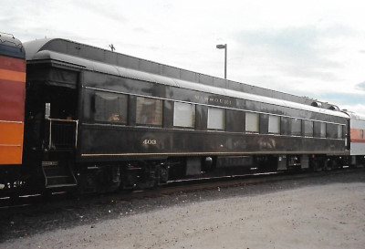 Missouri-Kansas-Texas open-platform business car 403 ex. John Marshall 1988, exx. MKT 864 1981, exxx. Allis Chalmers 1979, exxxx. Saline River and Northern 177, exxxxx. KCS 1961-1964, nee MKT 403.