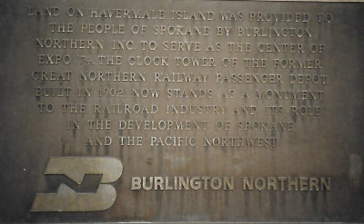 The Burlington Northern plaque on the side of the clock. We walked over to where the Looff Carousel and gondola ride over the Spokane Falls was but unfortunately both were closed on Mondays. Disappointed, we traversed the Spokane River over the pedestrian walkways.