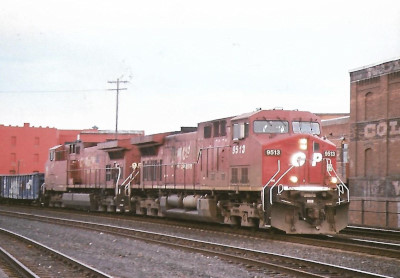 Canadian Pacific AC4400CW 9513 and AC4400CW 9529 lead a freight train through Spokane station area. We then left, had dinner at Perkins and returned to the hotel.