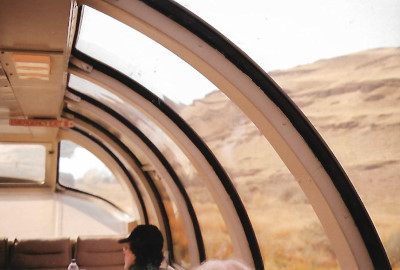 Looking out of the windows of the Super Dome and the train traverses the Columbia River Gorge.