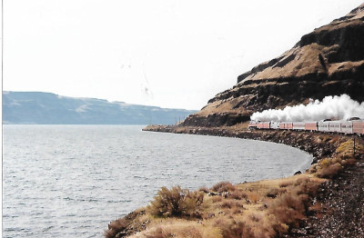 Southern Pacific 4449 leads its train along the Columbia River.