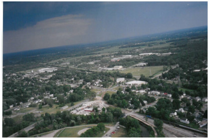 Aerial view of the Owosso area of Shiawasse County. The Train Festival site is in the upper centre and is the source of the smoke.
