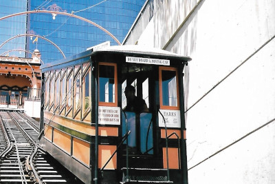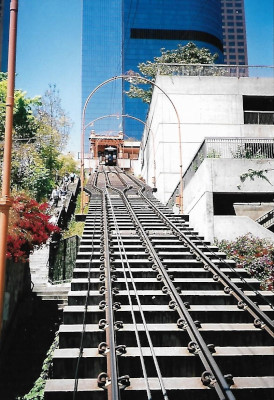 Angels Flight is a landmark 2'6" narrow gauge funicular railway in the Bunker Hill district of Los Angeles. It has two funicular cars, Olivet and Sinai, running in opposite directions on a shared cable, on the 298 feet long inclined railway. The funicular has operated on two different sites, using the same cars and station elements. The original Angels Flight location, with tracks connecting Hill Street and Olive Street, operated from 1901 until it was closed in 1969, when its site was cleared for redevelopment. The second Angels Flight location opened one half block south of the original location in 1996, with tracks connecting Hill Street and California Plaza.Built in 1901 with financing from Colonel J.W. Eddy, as the "Los Angeles Incline Railway", Angels Flight began at the west corner of Hill Street at Third and ran for two blocks uphill (northwestward) to its Olive Street terminus. Angels Flight consisted of two vermillion "boarding stations" and two cars, named Sinai and Olivet, pulled up the steep incline by metal cables powered by engines at the upper Olive Street station. As one car ascended, the other descended, carried down by gravity. An archway labeled "Angels Flight" greeted passengers on the Hill Street entrance, and this name became the official name of the railway in 1912 when the Funding Company of California purchased the railway from its founders. The original Angels Flight was a conventional funicular, with both cars connected to the same haulage cable. The railway was closed on May 18th, 1969 when the Bunker Hill area underwent a controversial total redevelopment which destroyed and displaced a community of almost 22,000 working-class families renting rooms in architecturally significant but run-down buildings, to a modern mixed-use district of high-rise commercial buildings and modern apartment and condominium complexes. Both Sinai and Olivet were then placed in storage at 1200 South Olive Street in Los Angeles. This was the location of Sid and Linda Kastner's United Business Interiors. At this location the Kastners maintained "The Bandstand," a private museum. The Bandstand featured antique coin-operated musical instruments where one of the cars (Sinai) was on display in the museum. Olivet was stored in the garage of the building. They were stored at this location for twenty-seven years at no charge in anticipation of the railway's restoration and reopening, which according to the City's Redevelopment Agency, was originally slated to take place within two years.