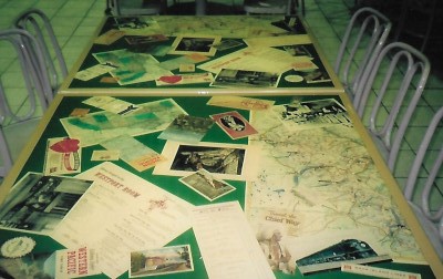 Railway maps, timetables, postcards and other memorabelia under glass in the tables of the Diner.