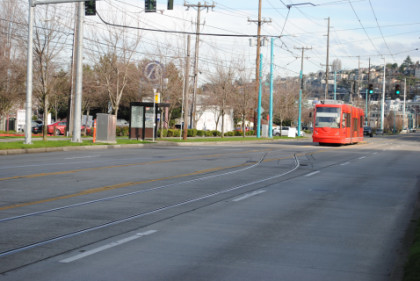 RouteThe Seattle Streetcar connects Downtown Seattle to Denny Triangle and South Lake Union. Northbound trains begin at McGraw Square in Downtown Seattle, located next to the Westlake Center and Pacific Place. The terminal is also part of the Westlake transit hub, which includes the Seattle Centre Monorail terminal at Westlake Center and the Westlake station in the Downtown Seattle Transit Tunnel for Link trains. The dual-tracked line travels north via a set of curbside transit-only lanes on Westlake Avenue and stops at 7th Avenue to serve the Amazon headquarters campus (including the Amazon Spheres) and the U.S. Courthouse. The streetcar passes several high-rise office and residential buildings before reaching its next stop, located between 9th Avenue (Blanchard Street) and Denny Way just east of Denny Park. The northbound track splits from Westlake Avenue at Thomas Street, running parallel one block to the east on Terry Avenue; a set of platforms between Thomas and Harrison streets serve the center of South Lake Union's office district. The northbound track is also connected to a spur track along Harrison Street that travels east to the line's operations and maintenance facility. After stopping between Mercer and Republican streets, the parallel streetcar tracks pass through the Google campus and rejoin on the north side of Valley Street, stopping at the entrance of Lake Union Park near the Museum of History & Industry and Centre for Wooden Boats at a former naval armory. The tracks briefly travel east before turning northeast onto Fairview Avenue, traveling in the street's median for one block. It reaches the streetcar's northern terminus at Campus Drive on the Fred Hutchinson Cancer Research Center campus, while a tail track continues north for a half-block to allow vehicles to switch tracks.