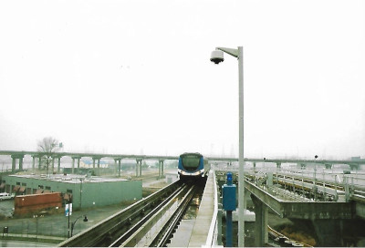 A Waterfront-bound Canada Line train arriving at Olympic Village station. We detrained and followed the signs to our next train ride, another new line (and mode) for us. This was the experimental streetar line from Olympic Village to Granville Island.