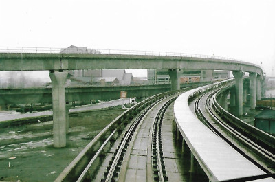 Passing a westbound Skytrain in the original livery of the line.