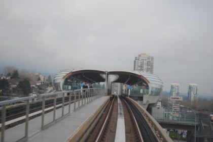 Amtrak Cascades 517 at Edmonds station. The two of us boarded Car 5 and enjoyed our ride, arrived at Pacific Central Station on time. After going through Customs and meeting up with Bob, we checked in to the Quality Inn Downtown, then walked over to the Yaletown/Roundhouse station of the Canada Line for our first ride on this new route which opened in August 2009.