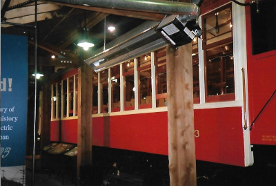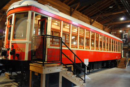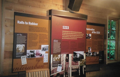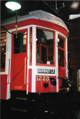 British Columbia Electric Railway interurban 1223 built in 1912. It entered service in 1913 and was retired in 1958. It was one of only seven B.C. Electric Railway cars saved from destruction. It was displayed outside in Burnaby but was vandalized and deteriorated in the elements to the point that it need to be restored and placed inside which happened after it arrived at the Burnaby Museum and Heritage Village.