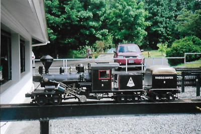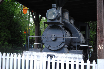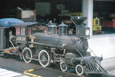 Canadian Pacific Railway 4-4-0 374, a one-eighth size model of the first locomotive to arrive on the West Coast in 1886. It is privately owned and was built by one of the Burnaby Central's founders.
