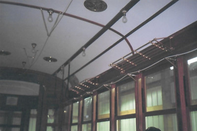 Looking up at the interurban which was raised so the trucks and undercarriage could be worked on.
