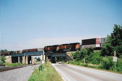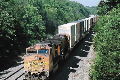 BNSF 7318 West passing BNSF 9788 East on the bridge.