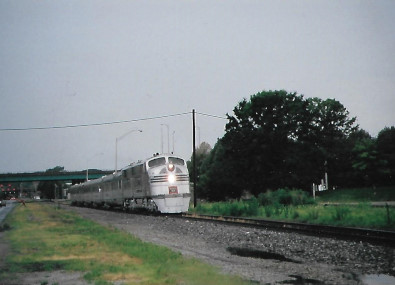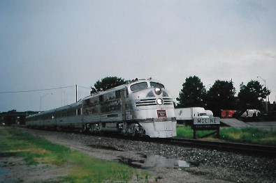 Chicago, Burlington and Quincy E5 9911A leading the Nebraska Zephyr trainset through Moline on a very wet morning.