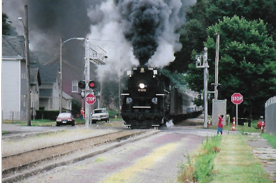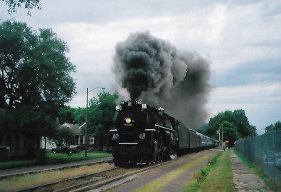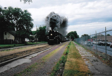 NKP 2-8-4 765 putting on a fantastic show as it travels down the middle of the street in Davenport on the way to Walcott.