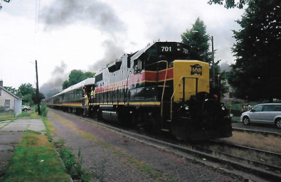 Iowa Interstate GP38-2 701 (ex. LLPX 2302, exx. UP 411 2011, exxx. UP 1911 1997, exxxx. EMDX 742 1987, exxxxx. CR 7942, nee PC 7942) bringing up the rear of the steam excursion. From here, we returned to Train Festival for the last time before driving to the grade crossing at Central Park Avenue to catch the 14:00 train on its way to Walcott.