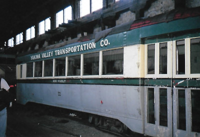 Yakima Valley Transportation Brill streetcar 22, built 1930. It was one of three Brill Master Units built new for the YVT and operated in Yakima until 1947 when it was sold to the Portland Traction Company and ran there until 1958. 22 was then sold to Robert Hively and displayed at the Puget Sound Railway Historical Association museum in Snoqualmie, Washington and returned to Yakima in 1989. It is presently awaiting restoration to operating condition.