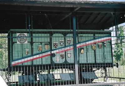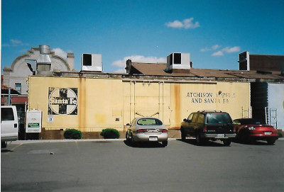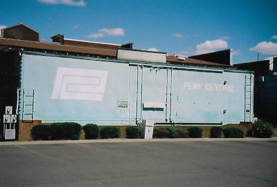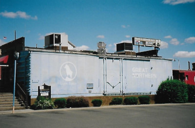 There were eight boxcars in a row, each a different business. I have no idea if they were original to the railways for which they were painted, and since they no longer exist, that information will probably remain a mystery. However, this is the Great Northern boxcar, number unknown.