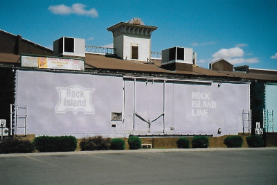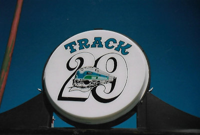 The sign for the outdoor shopping centre, Track 29, which was a series of businesses housed in boxcars connected by wooden walkways. It existed for a little over twenty-five years but most of the equipment was demolished in 2013 upon closure of the site.