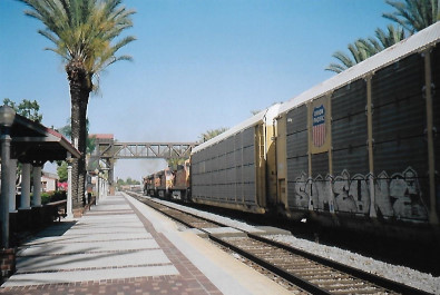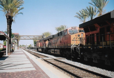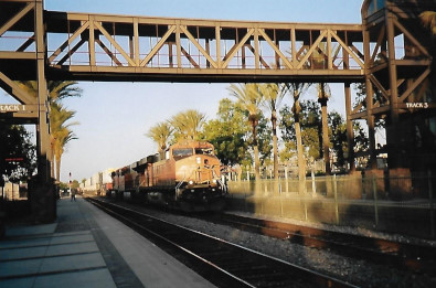 A southbound BNSF freight passes through Fullerton in the late afternoon.