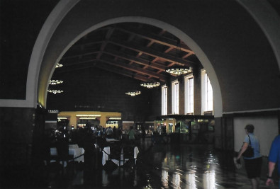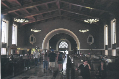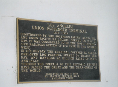 Los Angeles Union Passenger Terminal OverviewUnion Station, as it is also known, served to consolidate rail services from the Union Pacific, Santa Fe and Southern Pacific Railroads into one terminal station. Conceived on a grand scale, Union Station became known as the "Last of the Great Railway Stations" built in the country. The structure combines Art Deco, Mission Revival and Streamline Moderne style. It was placed on the National Register of Historic Places in 1980. Today, the station is a major transportation hub for Southern California, serving almost 110,000 passengers a day. It is by far the busiest train station in the Western United States; it is Amtrak's fifth-busiest station, and is the twelfth-busiest train station in the entire country. Four of Amtrak's long-distance trains originate and terminate here: the Coast Starlight to Seattle, the Southwest Chief and Texas Eagle to Chicago and the Sunset Limited to New Orleans. Amtrak's Pacific Surfliner regional trains run frequently to San Diego and also to Santa Barbara and San Luis Obispo. The station is the hub of the Metrolink commuter rail system and is a major transfer point for several Metro Rail subway and light rail lines. The Patsaouras Transit Plaza, on the east side of the station, serves dozens of bus lines operated by Metro and several other municipal carriers.