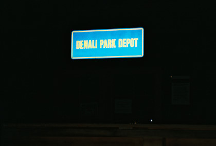 The Denali Park Depot sign was illuminated. It was a cool and breezy morning today but the excitement and anticipation of the day's activities kept us from feeling the cold. Chris and I helped people to board our coach and we departed on time.