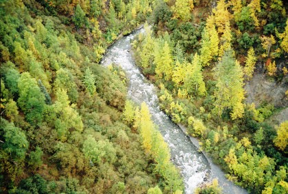 One last view at MP 308 before everyone re-boarded the train for the continuation of the journey. The next highlight was the crossing of Hurricane Gulch Bridge at MP 284.2. This bridge spans 918 feet and 296 feet above the creek. It was built in 1921. Since it was impossible to conduct a photo runby here, the train stopped on the bridge for ten minutes and the car hosts in each coach cycled their passengers through the vestibule so everyone could take photographs of the fantastic vistas of the countryside and river.