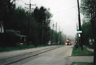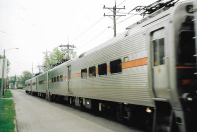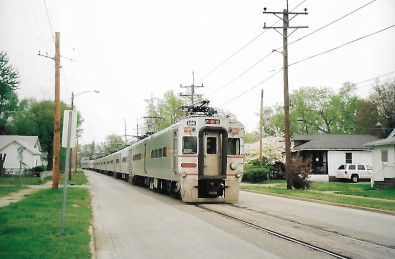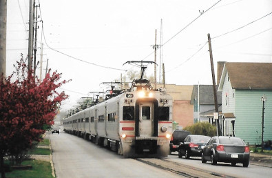 South Shore Line Train 111 taking passengers from Chicago to Carroll Street, making its way along 11th Avenue and curving onto 10th Avenue.