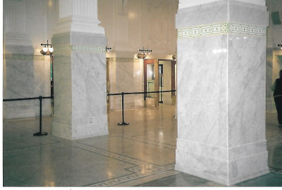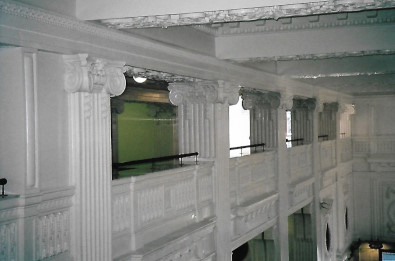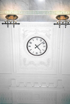 Opened on May 10th, 1906, it served as a union station for the Great Northern Railway and Northern Pacific Railway, both owned by James J. Hill. The station was designed by Reed and Stem (the architectural firm who designed New York City's Grand Central Station) and incorporated elements from various architectural styles with the San Marco bell tower in Venice, Italy, servinc as the model for the building's clock tower. It was placed on the National Register of Historic Places in 1973. While much of the exterior of King Street Station remained intact since its construction, parts of the interior were substantially altered in a series of renovations in the 1940s, 50s and 60s and others suffered neglect. After the end of World War II, as passenger rail travel began to decline across the United States, steps were taken to gradually modernize King Street Station. The ticket counters, once located directly to the east of the compass room, were expanded outward into the waiting room. In the late 1940s a set of "electric stairs" and a new side entrance to the second floor railroad offices were built over the open stairwell to Jackson Street, narrowing them by half. Over the next two decades, as train ridership and the station's number of employees dwindled, the station was further remodelled to reduce maintenance and heating costs. In the late 1950s the station's original high-back benches, made of yellow oak, were replaced by modern chrome and plastic seats. The final blow to the station's character occurred in late 1967 when, under the direction of Northern Pacific architect A.C. Cayou, a new drop ceiling of plastic and metal was installed in the waiting room ten feet below the original, concealing the hand-carved coffered ceiling to just below the balcony and second level arcade. Hundreds of holes had to be punched through the plaster to attach the ceiling's support wires to the steel frame of the building. The new ceiling held new fluorescent lights and heat lamps, replacing the original brass chandeliers and sconces. Below the new ceiling, plaster reliefs, marble panels, glass tile mosaics and other original fixtures were sheared from the walls and replaced with sheet rock and Formica paneling. The dedicated women's waiting room at the southwest corner of the building was converted into employee offices; its own architectural details suffering the same damage. The only original remaining features left visible in the main waiting area were the terrazzo tile floor and the clock on the west wall above the restrooms.