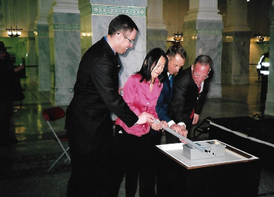 Ryan Hestor, Trevina Wang, Tom Rasmussen and Kevin Thompson throw the switch to turn on the chandelier.