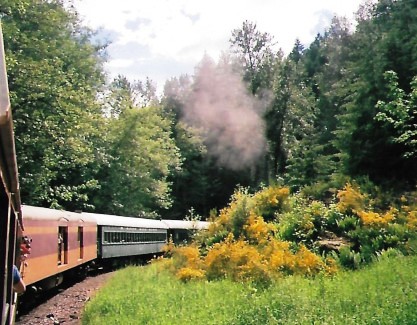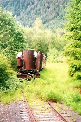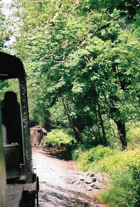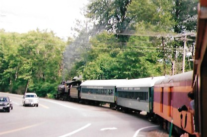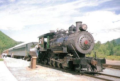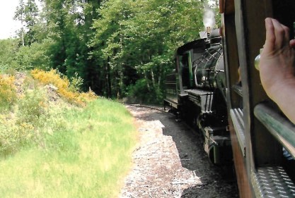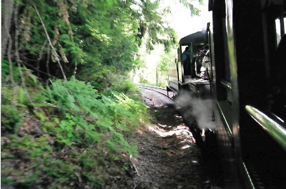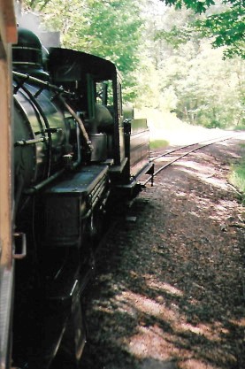 The steam engine has disappeared around the curve but the telltale smoke remains. We returned to Mineral and walked up to the steam engine. Neither Bob nor I could believe it when the fireman invited us into the cab and to stay there during the switching and servicing in the yard!