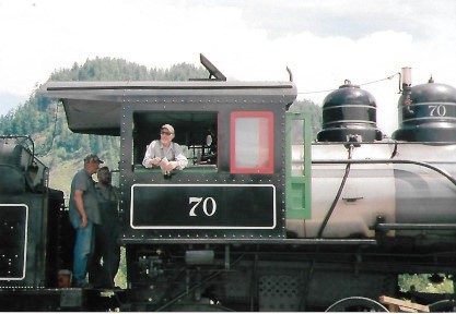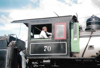 Brian Wise, General Manager of Mount Rainier Scenic Railway, in the cab of Polson Logging 2-8-2 70. Built in 1906 as wood-burning Polson Logging Company 45, it was converted to oil in the 1920s and worked until 1960, when it was retired and donated to the City of Hoquiam, Washington. It was on outdoor display there until 1988 when it was donated to MRSR for restoration.