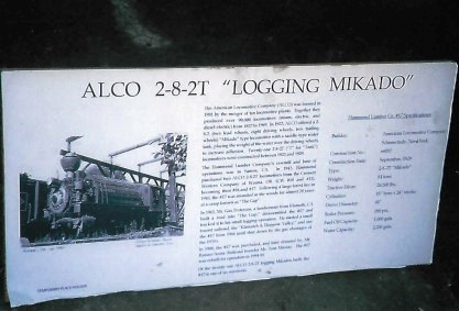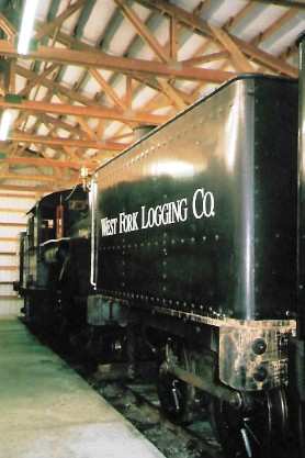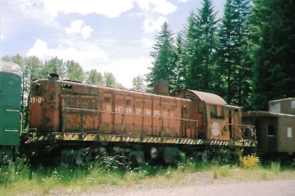 Satstop Railroad 0-4-2T 1 "Currie" built in 1885 (ex. Supermall display Auburn, WA 1995, exx. "C.F. White" display at Camp Grisdale 1935 to 1995, exxx. Simpson Logging 1 1935, exxxx. Peninsular Railway 6 1902, exxxxx. Shelton Logging Company 1 1899, exxxxxx. Penninsular Railway 1 1895, nee Washington Southern 1). It was moved to Mount Rainier Scenic Railroad in 2013.