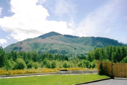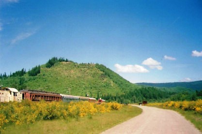 A view of some of the stored equipment and the hills around the Mount Rainier Scenic Railroad.