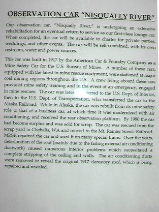 MRSR observation car "Nisqually River" built in 1917 as a Mine Safety Car for the United States Bureau of Mines, then the United States Department of the Interior then the Alaska Railroad. It was modernized and converted to a business car and rescued from a scrap heap in Chehalis, Washington in the early 1980's. It is undergoing restoration.