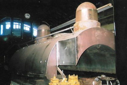 The boiler section of Santa Cruz Portland Cement 0-4-0T 2 (ex. Ray Pollard 1971, exx. Gunnor Henriolle 1966, exxx. Richard Cook, exxxx. Henry J. Kaiser, exxxxx. Bechtel Kaiser Rock Co 2 1924). It was built in 1909 and most recently had been displayed at Pollardville near Stockton, California.