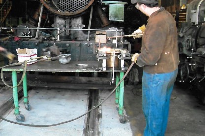 One of the volunteers watering the steam engine before the afternoon's run. A public demonstration was then given of how to pour a babbit bearing which would be used on Hammond Lumber 2-8-2T 17 which was undergoing restoration.