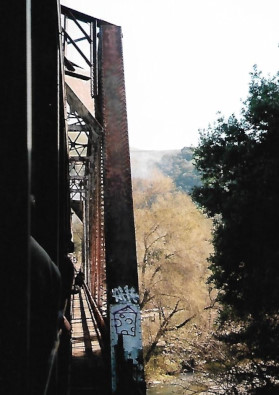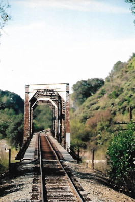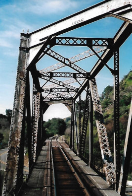I walked to the other end of the train and captured the view of the Dresser Bridge, originally built in 1866 as a 380 foot Howe Truss bridge which was damaged in the 1906 earthquake and replaced in 1906 with a steel bridge built by the American Bridge Company. We continued on to the third runby location at Farwell.