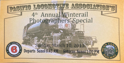 For several years during Winterail's Stockton years, either the Niles Canyon Railway or the Sierra Railway hosted a Post-Winterail Photographer's Special event. 2013 was no exception and it was the debut of Clover Valley Lumber 2-6-6-2T 4 after its lengthy restoration and the steam engine's first public excursion since 1985.