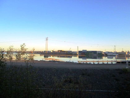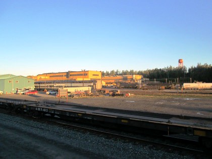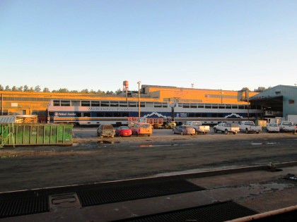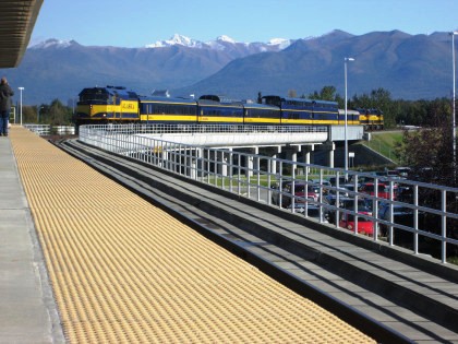Curving into the airport station, more correctly called the Bill Sheffield Alaska Railroad Depot at the Anchorage International Airport. This is the end of the branch, recently extended to this new train station which was built for the cruise ship trains. Bill Sheffield is a former Alaska Governor who signed legislation establishing the quasi-public Alaska Railroad Corporation and its seven-member board of directors as part of the process of Alaska acquiring the railroad from the federal government.