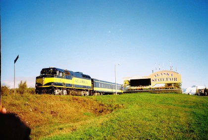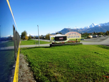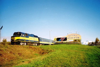 The convention train at the State Fairgrounds. The train was then re-positioned to be by the Alaska State Fair sign.