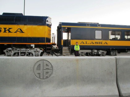 Chris used these concrete barriers with the Alaska Railroad emblem to juxtapose them with the train and me at the door of the coach we were car hosting in today.