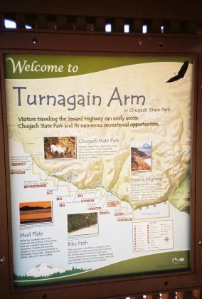 This information board shows how long Turnagain Arm is. Potter marks the junction of Cook Inlet and Turnagain Arm, so named when Captain Cook's 1778 search up the arm of the Northwest Passage ended when he had to "turn again".