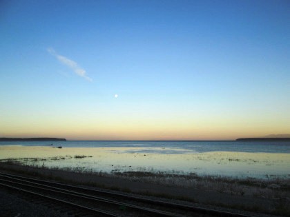 Snow-covered mountains on the way back. The train returned us to Anchorage after a tremendous day of rare mileage. Chris and I returned to the hotel, relaxed and freshened up for the banquet. We mingled with a variety of people during the social hour.
