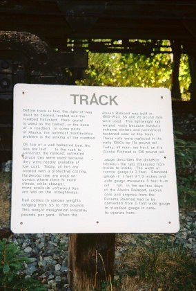 This explanatory sign describes how track is laid and the various types of track that have been used on the Alaska Railroad over time.