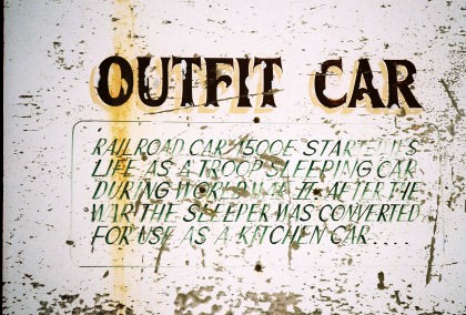Alaska Railroad Outfit Car 1500E which began as a troop sleeper during World War II and was converted to a kitchen car for use in maintenance-of-way service.