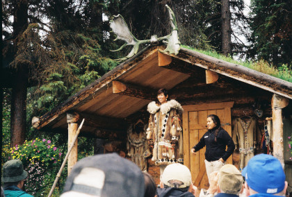 The two Athabascan Indian guides (Elizabeth and Grace) model and discuss the handmade clothing.