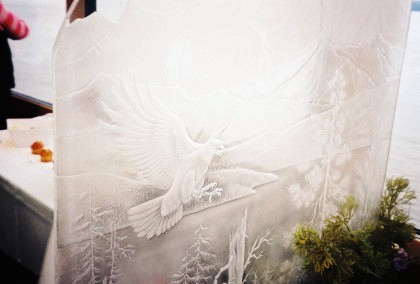 The etched glass partitions.